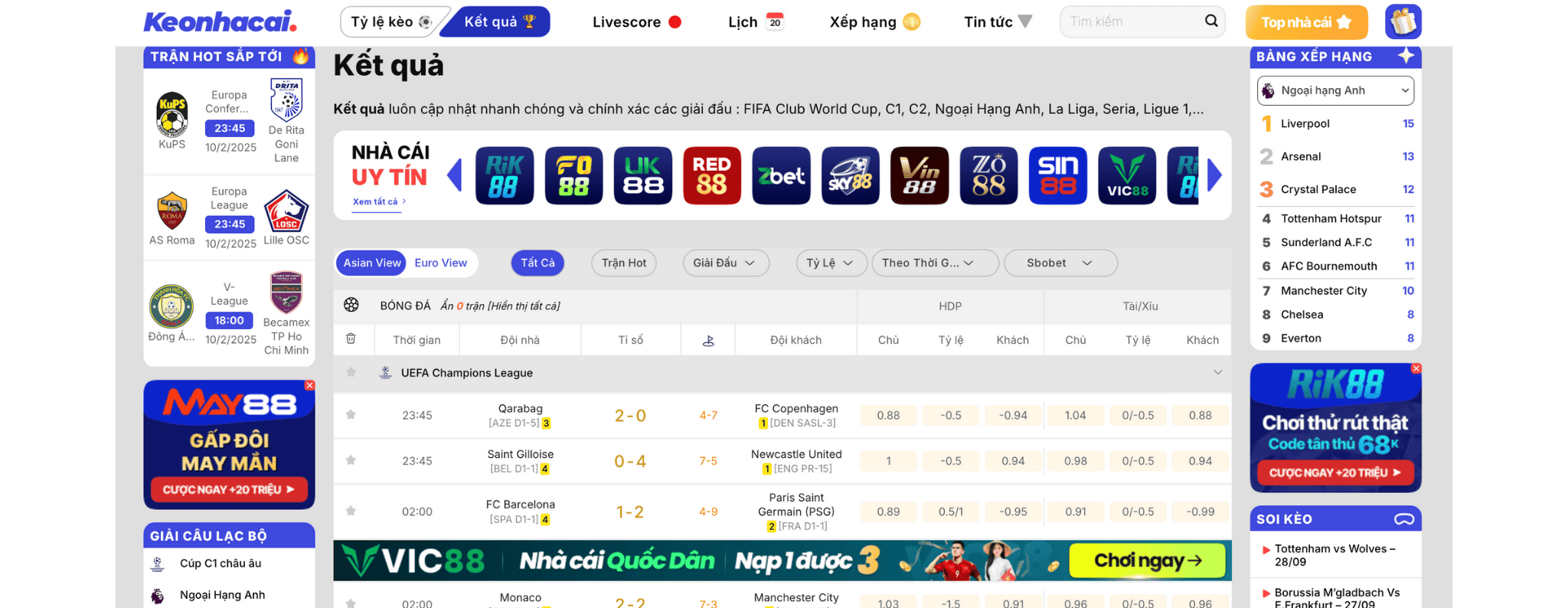 Kết quả luôn cập nhật nhanh chóng và chính xác các giải đấu : FIFA Club World Cup, C1, C2, Ngoại Hạng Anh, La Liga, Seria, Ligue 1,…